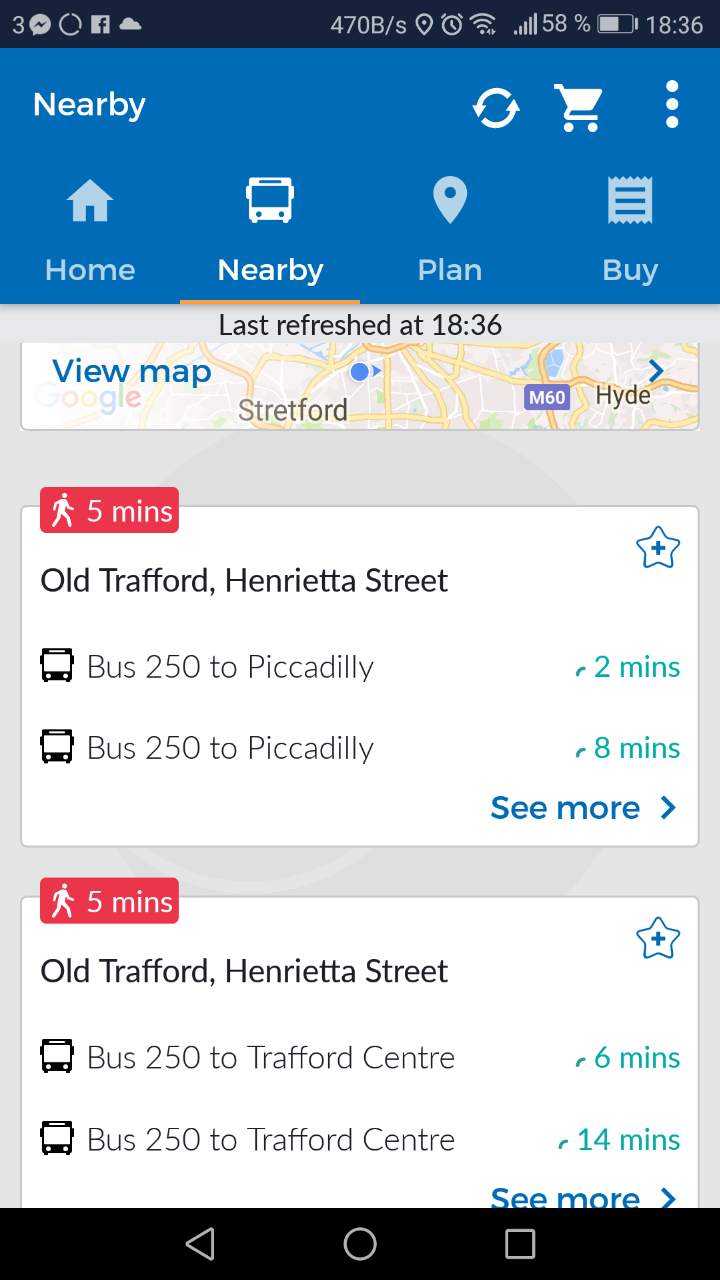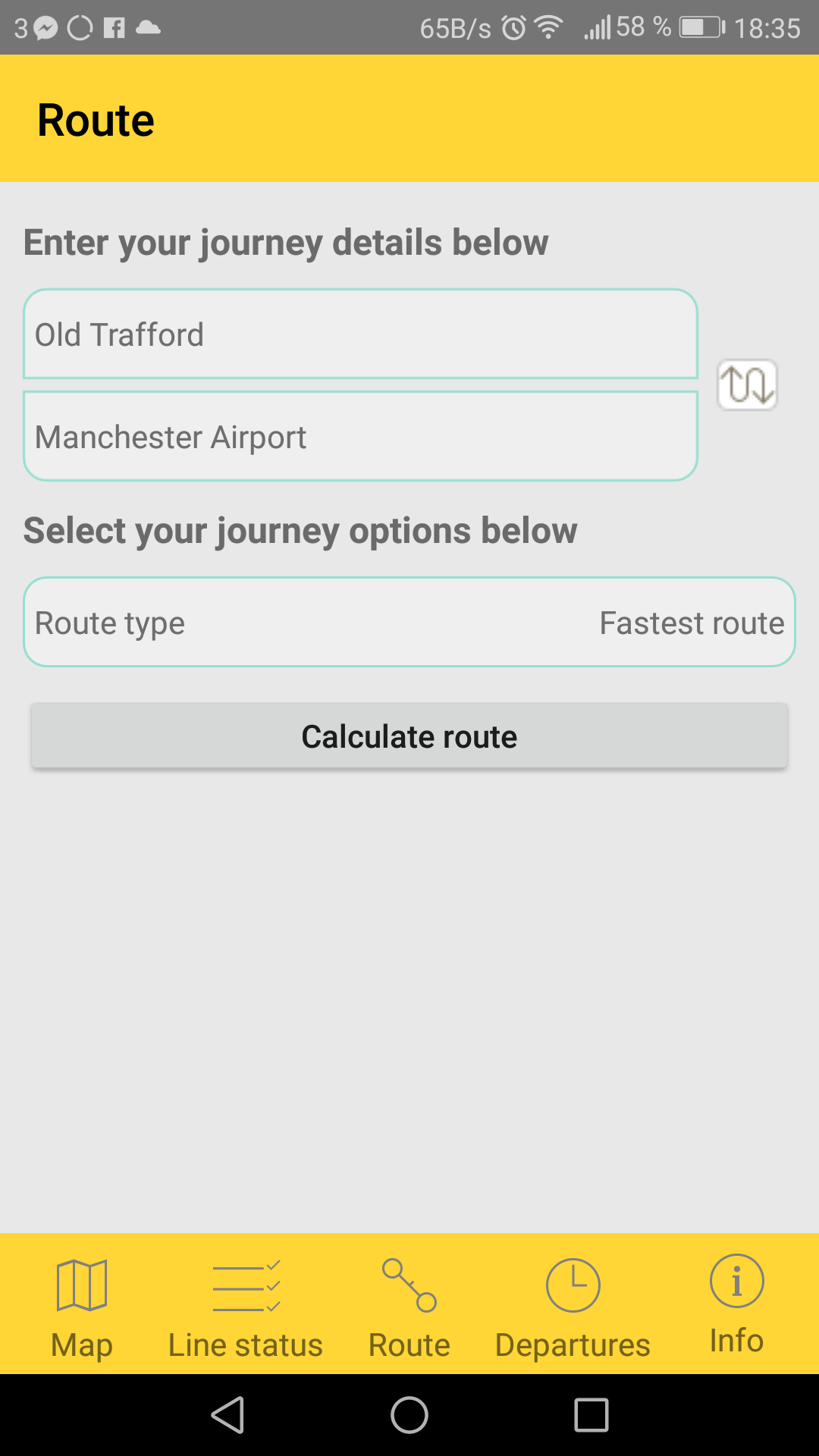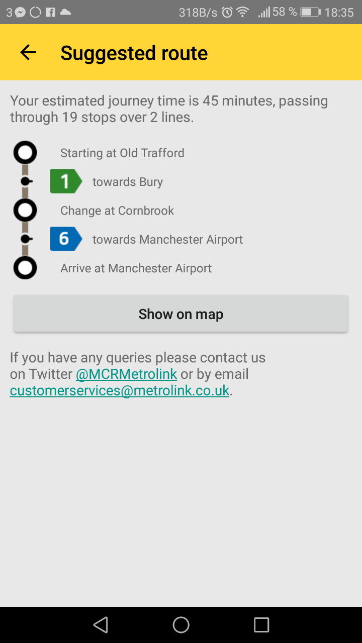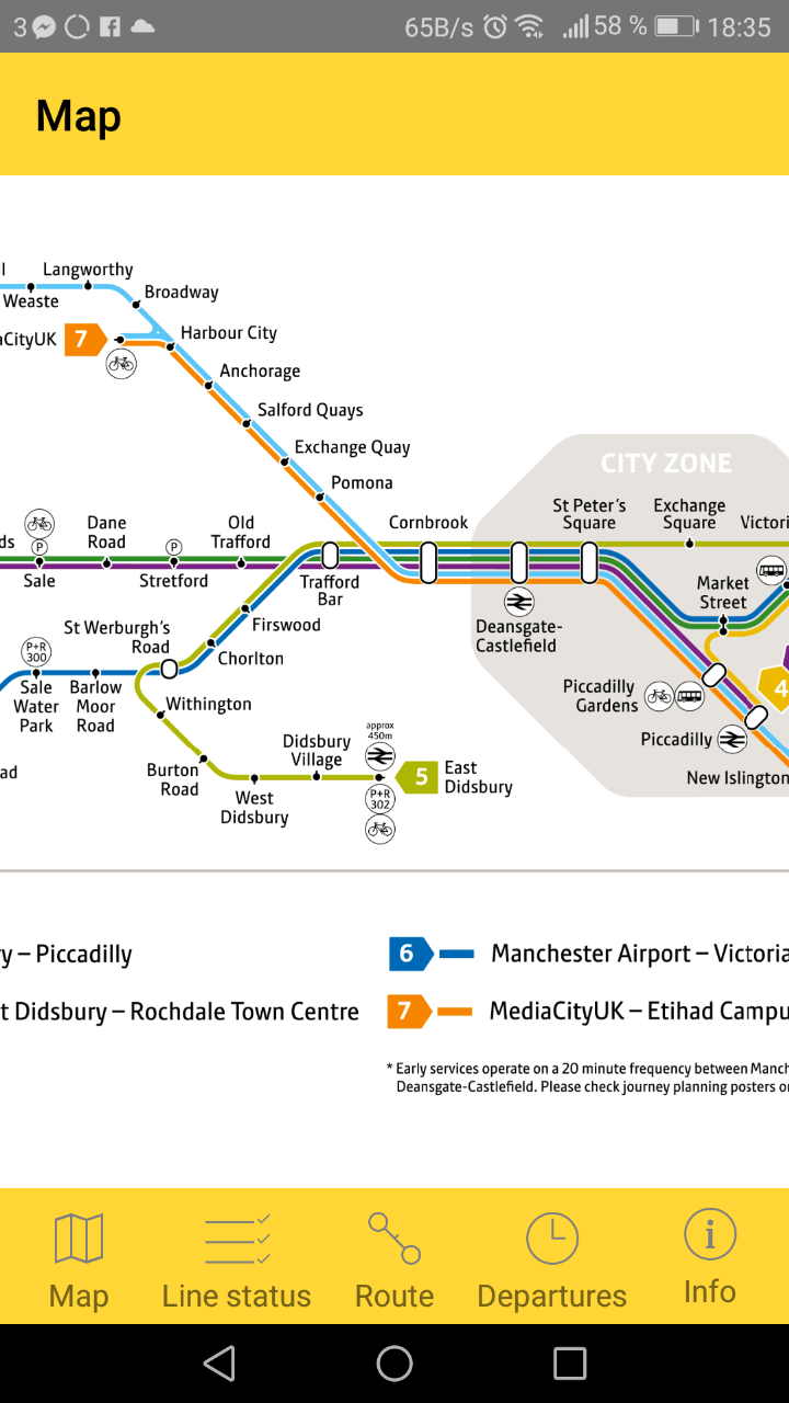 Mapa Metrolinku pro Manchester a pod ní aplikace.